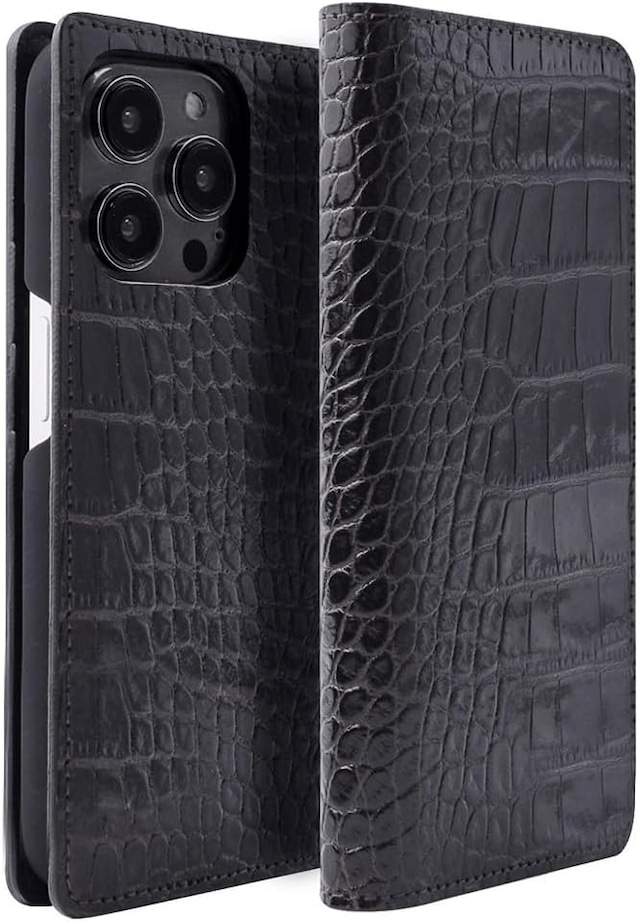 ABBI SIGNATURE iPhone 15 Pro Max 用 ケース 日本製 手帳型 本革 LIPARI イタリアンレザー ダイアリーケース MagSafe対応 [ クロコダイル 型押しレザー ハンドメイド 耐久性 レザーケース V字式カードポケット ワイヤレス充電 ] アイフォンケース アップル アイフォンケース 横開き ABS26196i15PM ブラック 【国内正規品】