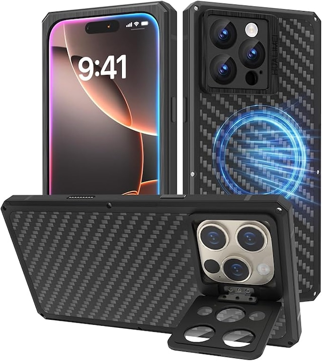 iPhone 16 Pro MAX 用ケース スタンド付き MagSafe 耐衝撃 炭素繊維全面保護カバー 強化ガラス 保護 カメラ隠れスタンド内蔵 いphone16pro maxケース 用マグネットスマホケース (ブラック, 16Pro Max)