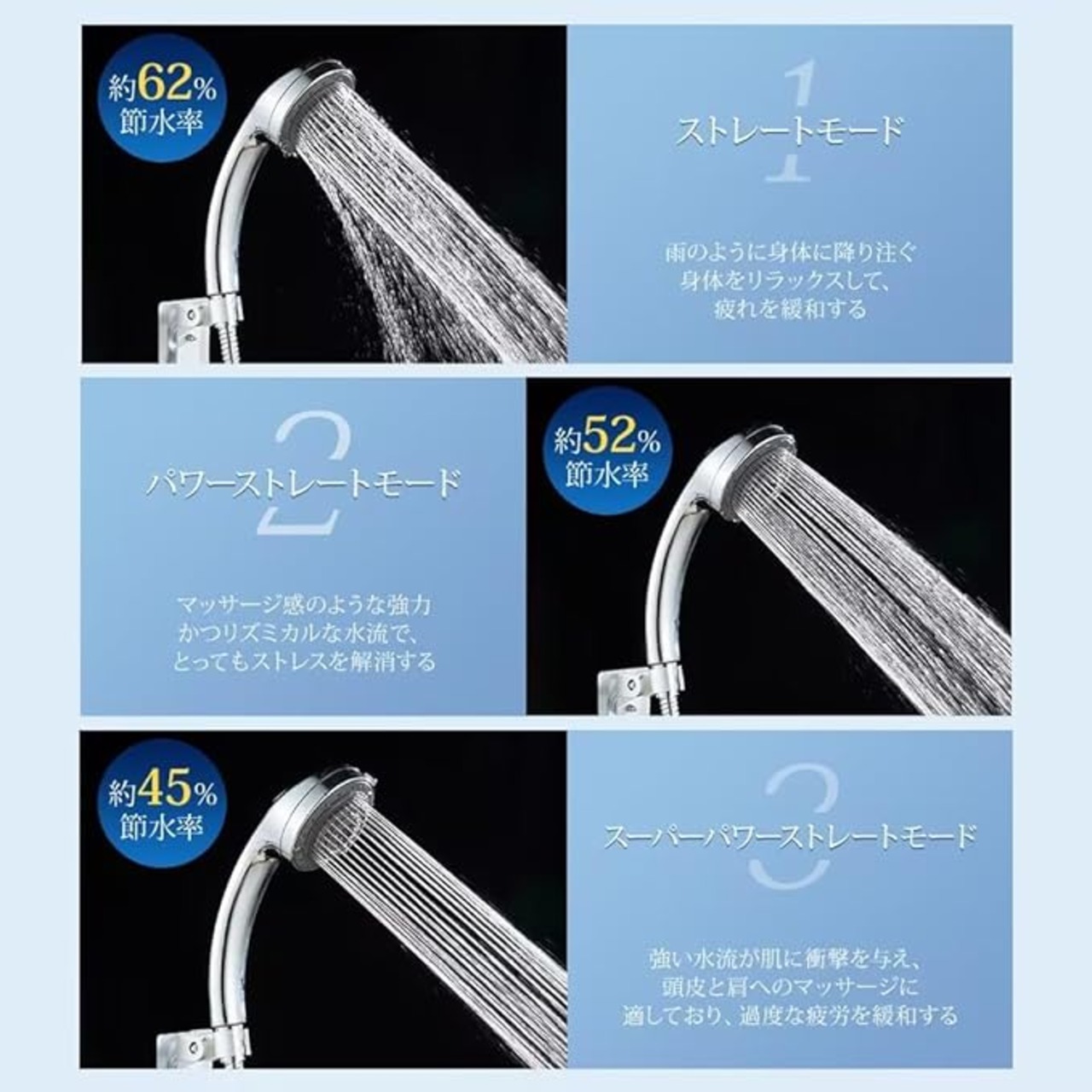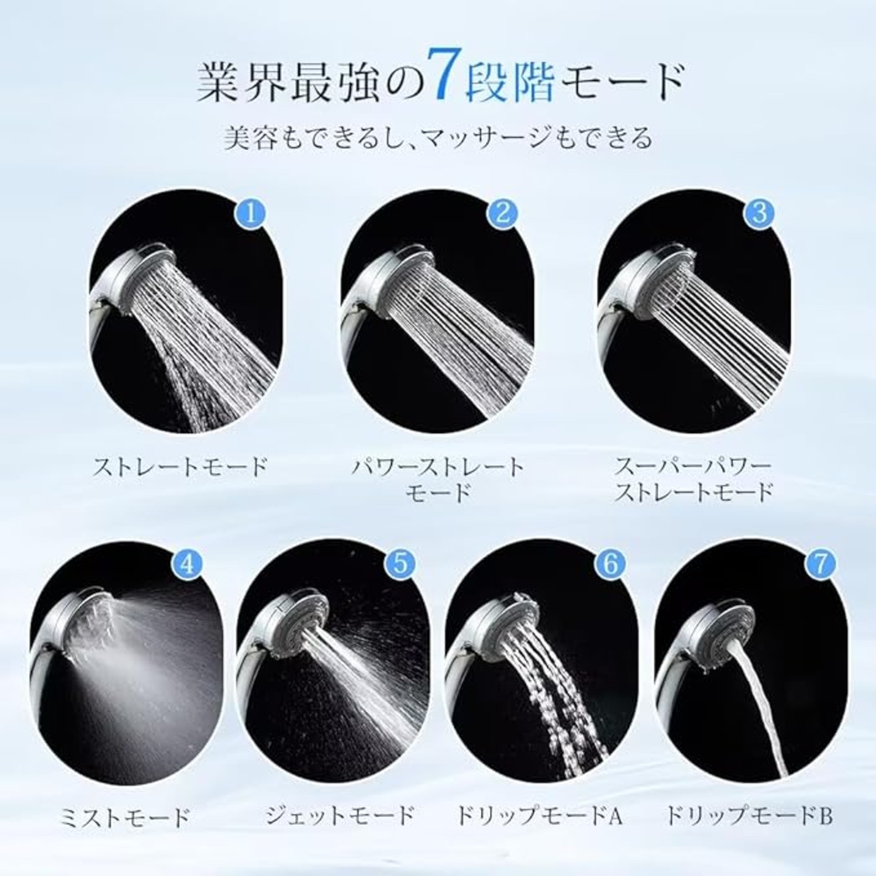 7種類の水量調節モードがあり、どんな入浴体験もできます。汚れや皮脂をきれいに落とします。
