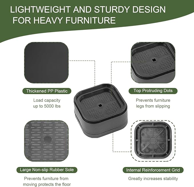 【頑丈さと重型の支え】火燵 足 継ぎ足しは頑丈で、滑り止めと衝撃吸収ABSで作られ、床を傷つけることはありません。 その強度は5000ポンドの重家具を扱うことができます。 底面は滑り止め仕様で、滑りやすくなったり、床を傷つけたりしません。 家具と床を保護しながら、収納スペースを提供します。