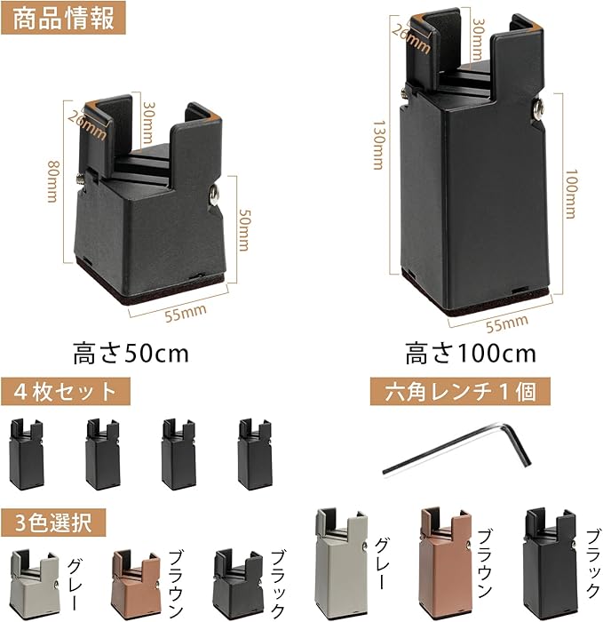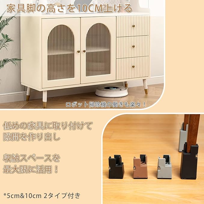 【高さを上げる】適切な高さの家具脚を選択し、家具の高さを増やします。家具を高くすることで、底の掃除がしやすくなり、底の収納スペースを増やすことができます。