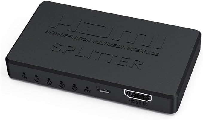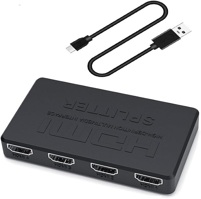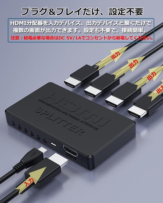 HDMI分配器 1入力4出力 同時出力 HDMI スプリッター ハブ 4画面 hdmi 増設 オーディオ同期 自動切替 4K 3D 1080p 複数出力 ミラーモード 接続簡単 PS5|Xbox|fire tv stick|HDTV|DVD|PCなど幅広く対応 USB電源ケーブル付き