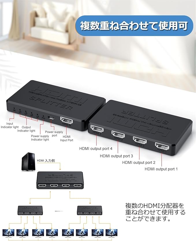 4画面同時出力: 1入力から4出力に分配可能なHDMIスプリッターハブです。