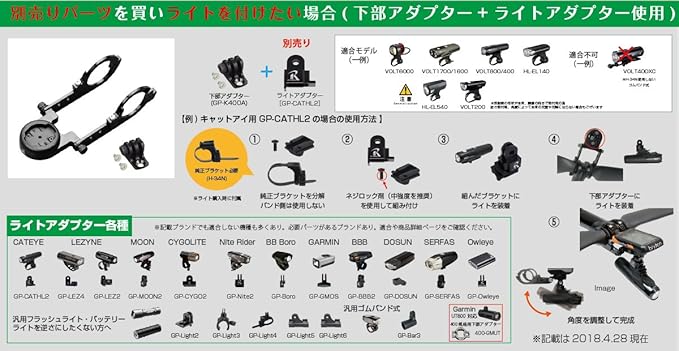 [BRY-Narrow19+GP]は 例) 別売りのライトアダプター CATEYE用 タイプ2[GP-CATHL2] を追加すればキャットアイのライトが装着可能 その他レザイン用 MOON用 汎用用など設定あり