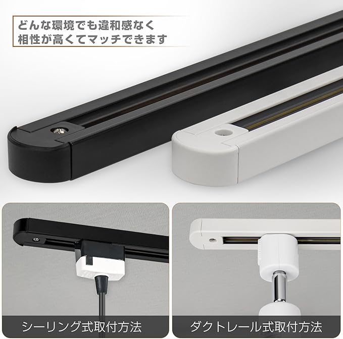 【ライトと自由に組み合わせ可能】配線ダクトレールにスポットライトやペンダントライトなどの照明器具を自由に配置できます。設置空間に溶け込みやすいホワイトとブラック2色を用意しており、違和感なくお好みに合わせたインテリア演出が楽しめます。家や店舗など様々な空間に適用され、おしゃれな雰囲気を簡単に創り出せます。