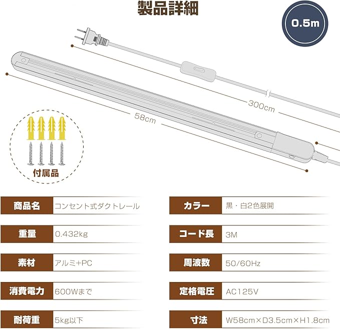 【製品仕様】商品名:コンセント式ダクトレール 寸法:全長約W58.3cm D3.5cm H1.8cm コード長:3M 重量:0.432kg 材質:アルミ+PC カラー:黒 (ブラック) 定格電圧/電流:AC125V 7A 600Wまで 取付け可能器具の総重量:5kg以下。ご注意:スポット器具・電球別売り