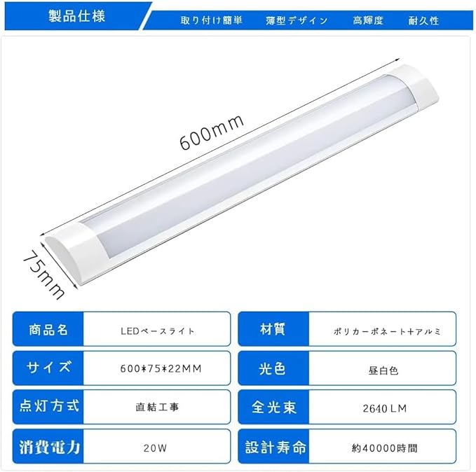 【製品仕様】1.商品名:LEDベースライト。2.口金:直結 。3.色温度:昼白色5500k 。4.入力電圧:AC100V。5.定格消費電力:20W。6.周波数:50/60Hz。 7.定格寿命:約40000時間。8.全光束:2640lm。付属品には取付金具、連結ケーブル、コネクター、ネジなどが付いています。ライトずつに付属品が付いています。