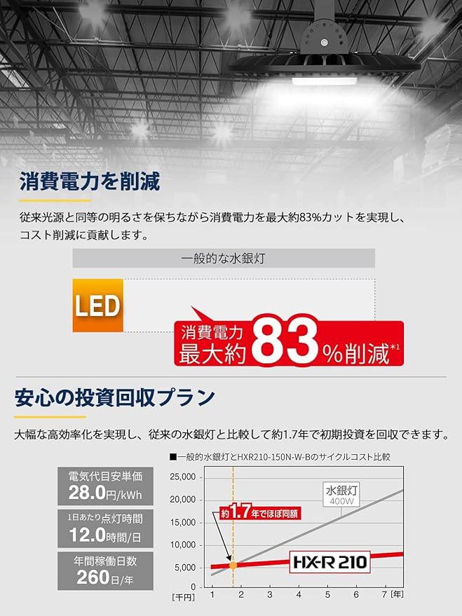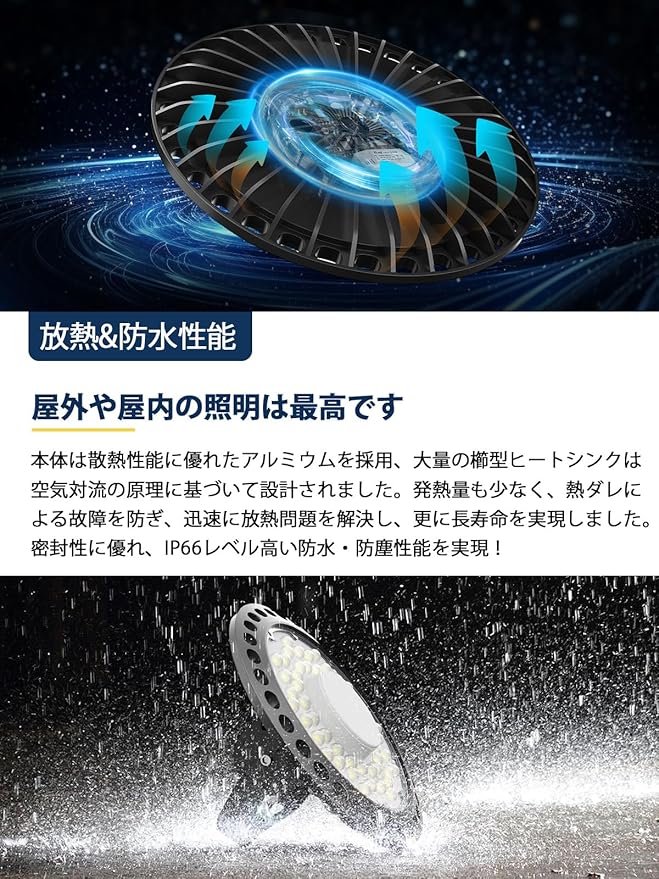 【優れた放熱性能・長寿命化】いつもled高天井照明の寿命が短くなる原因は基本的に熱なのです。高天井灯は、放熱が追いついていないと寿命が短くなるのです。弊社の高天井灯は、散熱性能に優れたアルミウムを採用し、放熱が速く、効率が良く、更に大量の櫛型ヒートシンクは空気対流の原理に基づいて設計されることで、熱ダレによる故障を防ぎ、迅速に投光器の放熱問題を解決し、更に長寿命を実現しました。放熱スペースを十分に確保し、同時に放熱面積を大幅にアップしました。