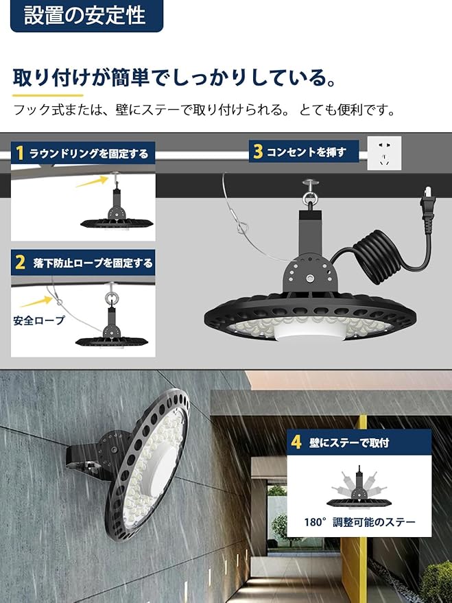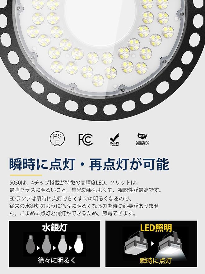 【2種類のPSE安全認証取得済み!安心・安全!】当店のled高天井灯は2種類のPSEマークとアース付いています。投光器のコンセントの先と本体の上に特定電気用品PSE・特定電気用品以外の電気用品PSE2種類のPSEマーク安全認証をそれぞれ取得しております。障害の発生による消費者への危険が防止され、安全使用が保証されます。 お客様の安全の為に、ぜひPSEマークを目印に、安全が確認された当店の商品をお選びください!