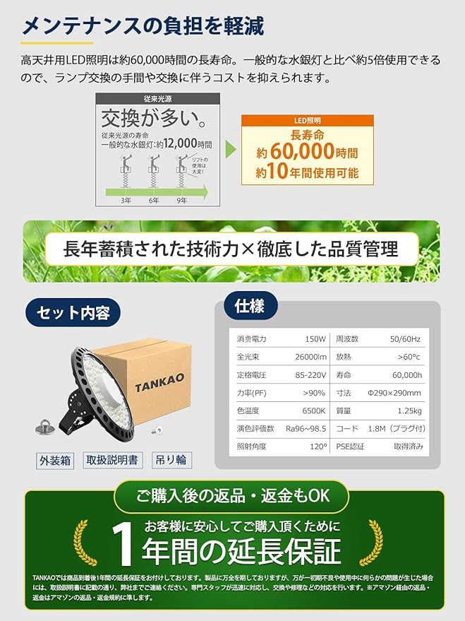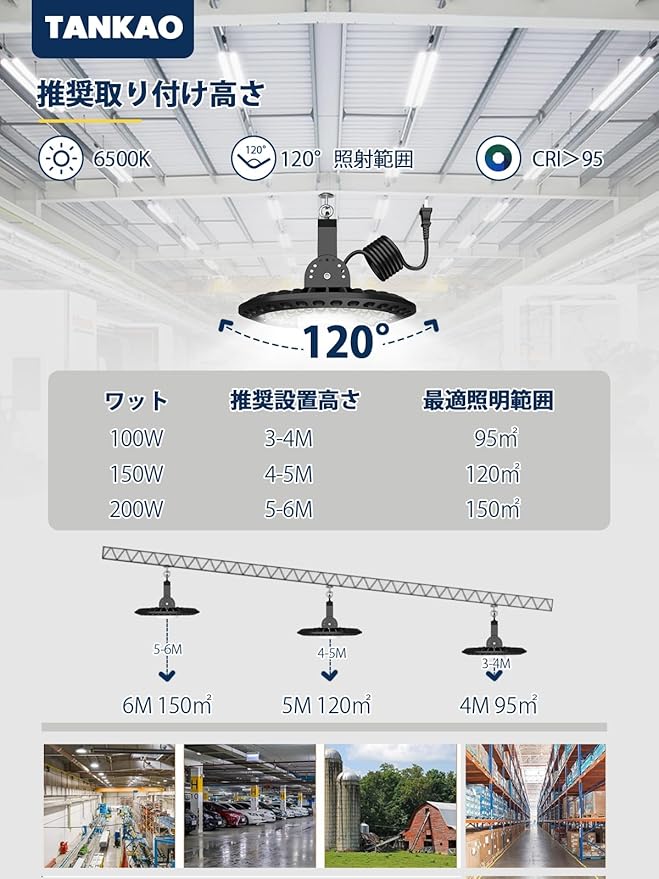 TANKAO led投光器 投光器 高天井灯 LED高天井照明 150W 防水 100V 高輝度 26000lm 6500K 昼白色 UFO型 IP66 ハイベイライト 85-220V ガレージライト 掲示板 体育館 展覧会 駐車場 運動場 工場 倉庫 車庫 高天井用 天井吊り用 屋内 屋外 プラグ付 2m配線 PSE認証 | KAZESHOP