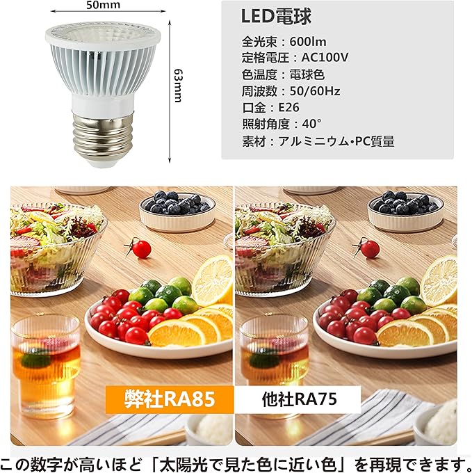 【高輝度&集光タイプ】電球の全光束は500LMの高輝度、演色指数は80分+、物の本当の色を復元できる上に、光は眩しかなくくてちらつきがありません。照射角度は40 で光線が更に集中、照らされた物が色鮮やかになったり、美しさを引き出します。