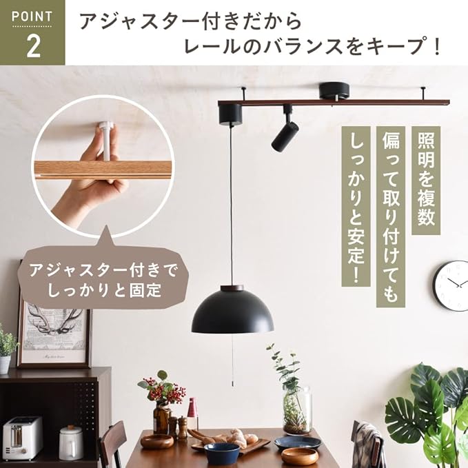 【アジャスター付きだからレールのバランスをキープ!】両サイドにある固定用アジャスターで天井と固定ができるためダクトレールの傾きを防ぎます。ライトの位置によってダクトレールが偏ったりせずしっかりと安定するのでライトを複数取り付けても安定性がバッチリです。そのため、あらゆる照明をご使用いただけます。