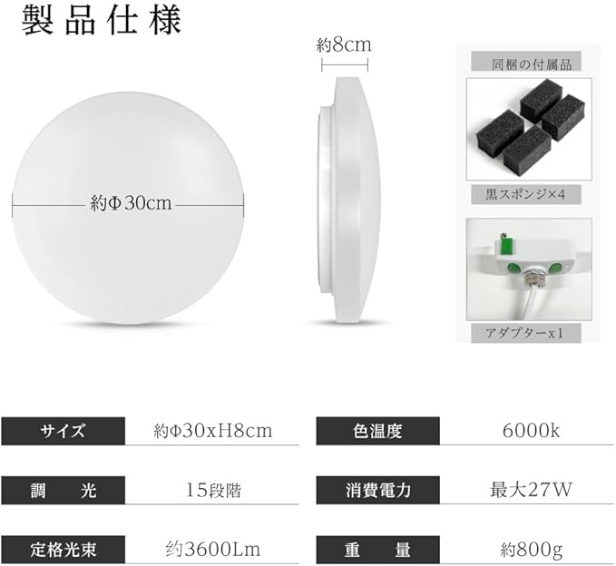 【製品仕様】商品サイズ:約Φ30xH8cm / カラー:ホワイト /適用畳数:6畳 / 調光:15段階/消費電力:26W / 定格光束:3600lm / 色温度:6000k / 重量:450g