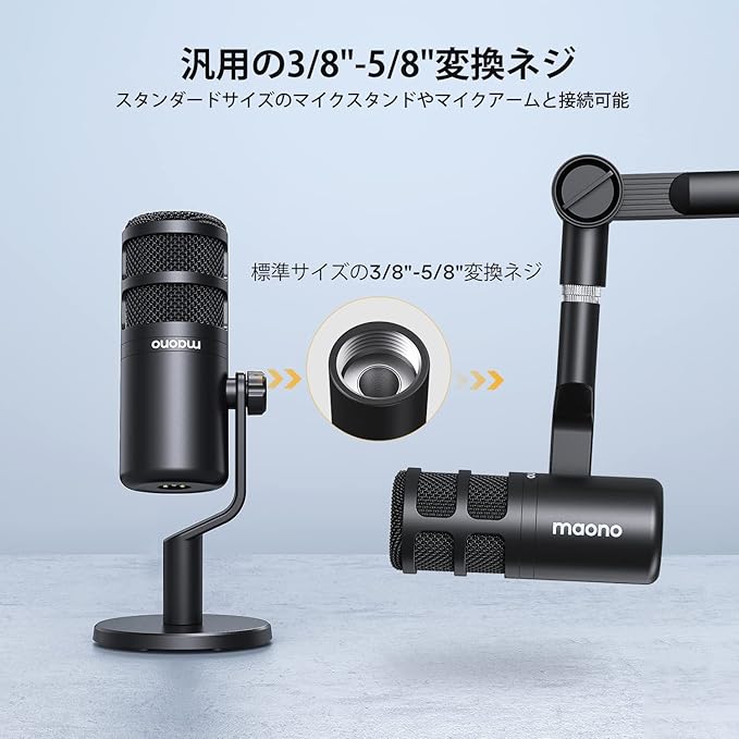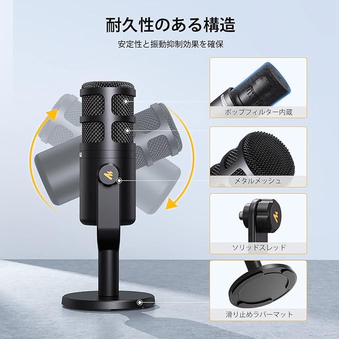 【頑丈なオールメタル構造】シンプルでスタイリッシュなXLRマイクには、6cmの取り外し可能なマイクホルダー延長ロッドが付属しており、マイク角度を上下270 に調整可能、快適な高さと位置を得ることができます。滑り止めラバーマット付きの厚い台座は、安定性とデスクトップからの振動を抑制し、クリーンな音を提供します。また、3/8"-5/8"標準サイズのマイクブームアームと併用することができ、より多くの選択肢を提供します。(ブームアームは含まれていないです。別購入する必要があります。)