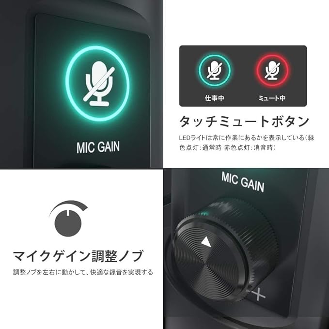 【タッチミュートボタン&マイクゲイン調整ノブ】タッチセンサー式ミュートボタンが付き、ミュートボタンを押すと録音を一時的に停止し可能です。LEDライトが付き、仕事中は緑色を点灯して、ミュート中は赤色を点灯します。マイクゲイン調整ノブも付いており、調整ノブを左右に動かして、ボリュームを調節でき、お使い便利です(ゲイン調整のノブは音声の入力感度性調整を通じて、ボリュームをコントロールできます)。