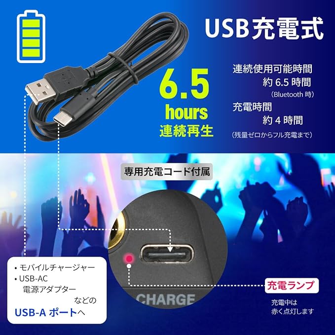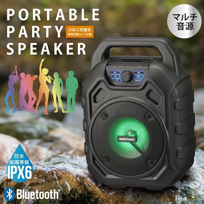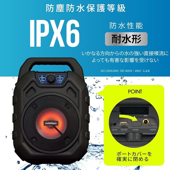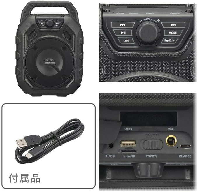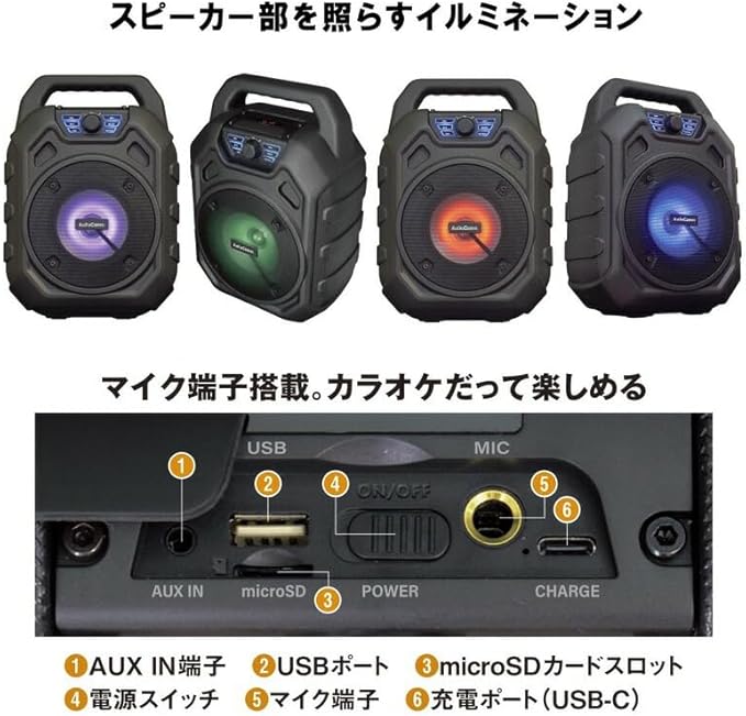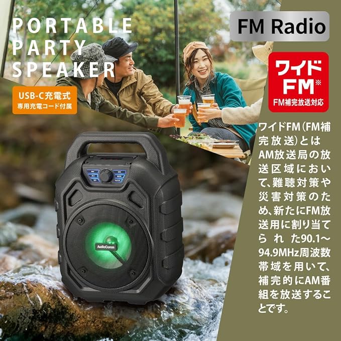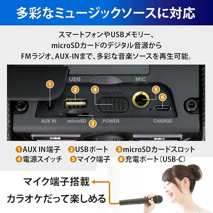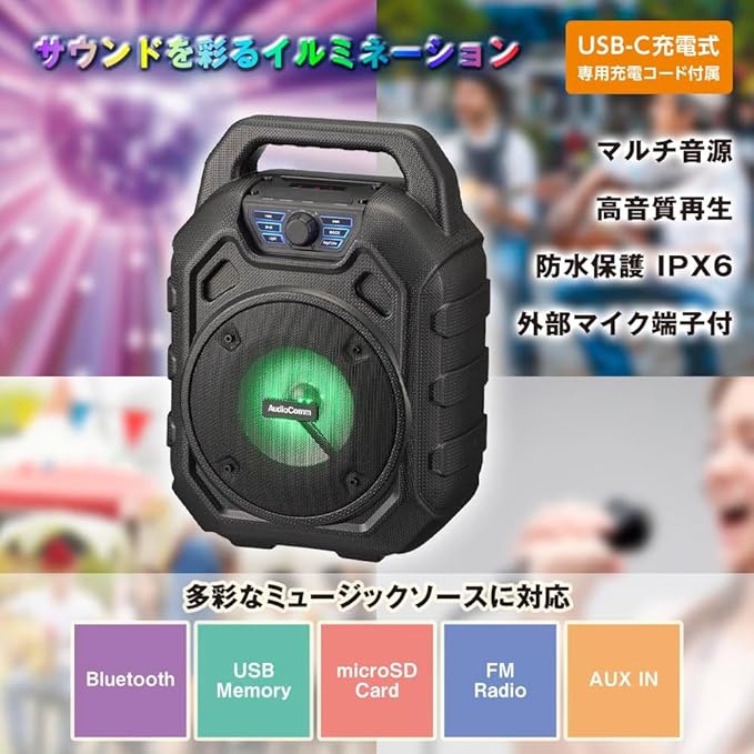 【 特 長 】 ◆多彩なミュージックソースに対応…スマートフォンやー、microSDカードのデジタル音源からFMラジオ、AUX-INまで、多彩な音楽ソースを再生可能 ◆外部マイク端子搭載で、カラオケも楽しめる ◆サウンドを彩るイルミネーション ◆高音質再生 ◆屋外でも使えるIPX6…雨に降られても安心の防水保護等級 IPX6(耐水形)で好きな場所に持ち運んで音楽などを楽しめます ◆ワイドFM(FM補完放送)対応 ◆USB-C充電式(専用充電コード付属)