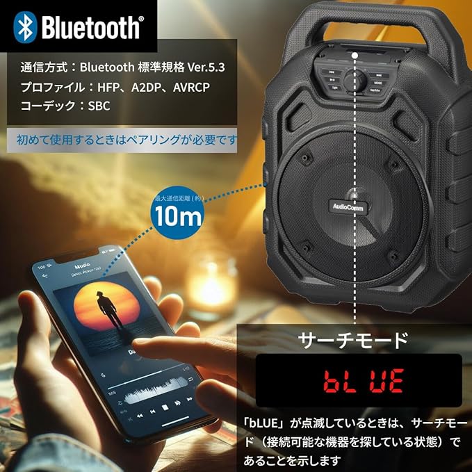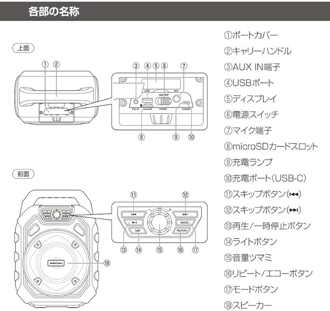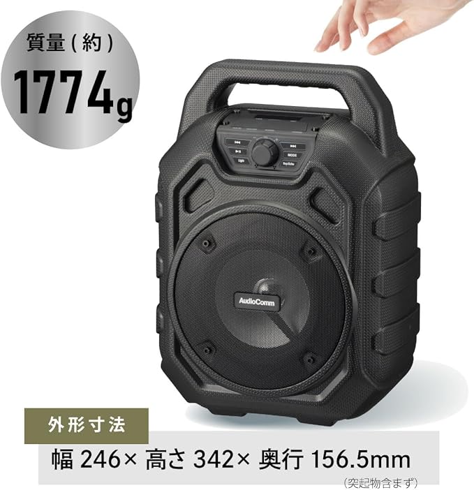 ◆Bluetooth:通信方式…Bluetooth標準規格 Ver. 5.3プロファイル…HFP、A2DP、AVRCPコーデック…SBC変調方式/周波数帯域…GFSK/2.402~2.480GHz最大通信距離…見通し 約10m(Class2) ◆ー:Type-A FAT・FAT32 最大32GB、ファイル形式…MP3 WMA WAV ◆microSDカード:FAT・FAT32 最大32GB、ファイル形式…MP3 WMA WAV ◆ラジオ:FM…76-108MHz (内蔵アンテナ) ◆充電時間:約4時間 (残量ゼロからフル充電まで) ◆連続使用可能時間:約6.5時間(Bluetooth時) ◆防水保護等級:IPX6…耐水形(いかなる方向からの水の強い直接噴流によっても有害な影響を受けない) ◆許容動作温度/湿度:温度:0~45℃ 湿度:10~85%(結露なしにて) ◆外形寸法:幅246 高さ342 奥行156.5mm(突起物含まず) ◆質量:約1774g ◆付属品:専用充電コード (USB-C/USB-A、コード長 約1.2m)、保証書付取扱説明書