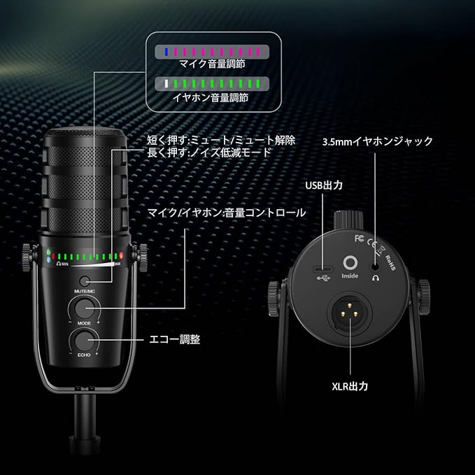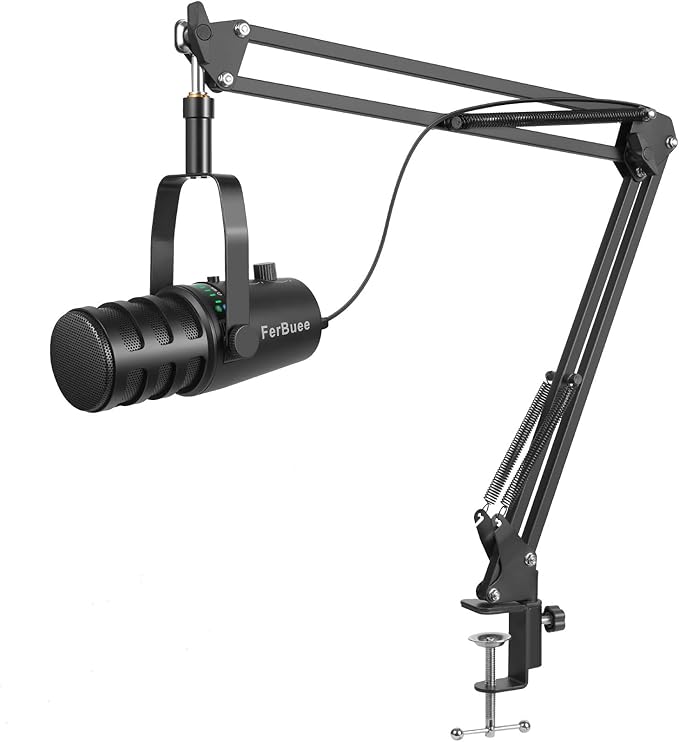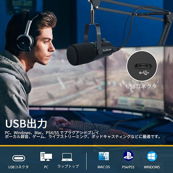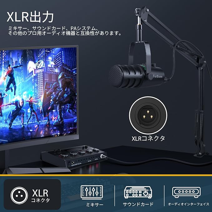 FerBuee USB XLR ダイナミックマイク パソコンマイク イヤホン出力端子あり 単一指向性 エコー ミュート機能付き 音量調節 オーディオミキサー/オーディオインターフェース対応 録音 ゲーム実況 ボイズチャット ライブ配信 PC(Windows/MacOS)対応可能 PS4/PS5に対応 アーム スタンド付き (WS801) | KAZESHOP