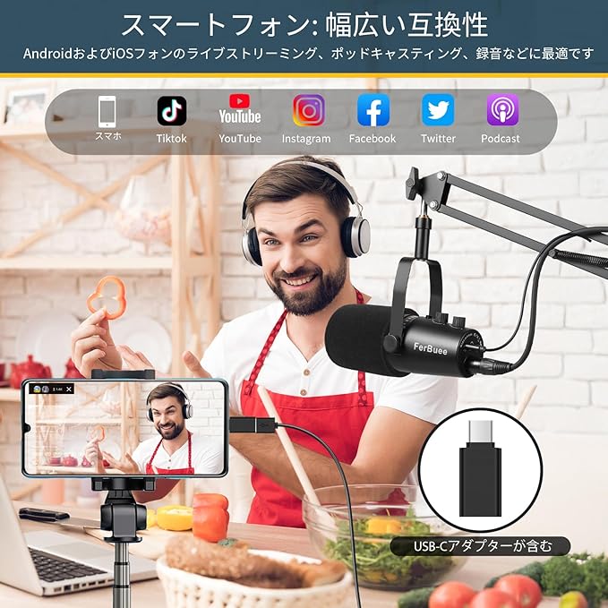 【パッケージ内容】USB XLRダイナミックマイク*1、 USB-C to USB-A/C ケーブル*1、USB-Cアダプタ*1、ブーム アームスタンド*1、フロントガラス*1、日本語取扱説明書*1。FerBuee全ての商品は12ヶ月の安心保証が付いています。何か問題があった場合に、いつでもお気軽にご連絡ください。