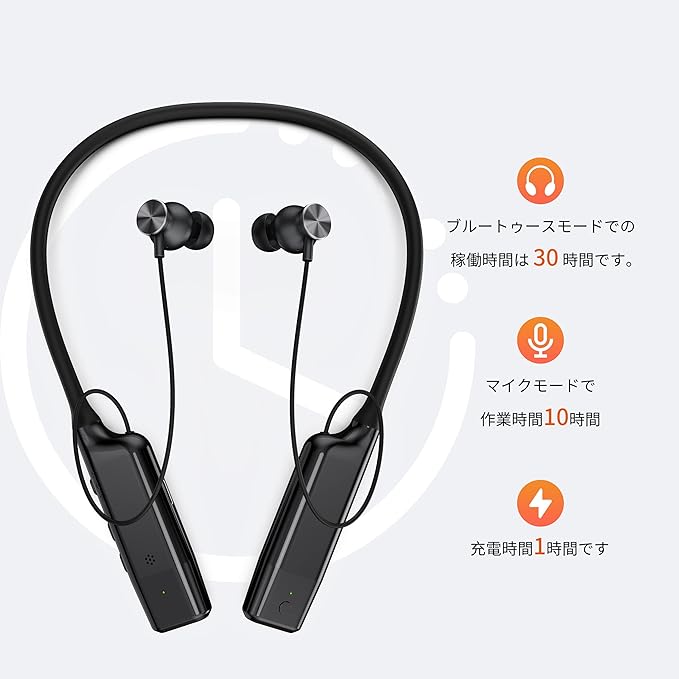 【ワイヤレスマイクモード+bluetoothイヤホンモード2in1】①首掛けワイヤレスマイク用type-c端子受信機は内蔵、受信機を携帯電話などの設備に挿入するだけ、自動ペアリングし、スマホ外付けマイクになって、録音できます。ワイヤレスマイク録音距離は最大20メートルです。録音モニター機能付き、モニターイヤホン付き。②Bluetoothネックバンドイヤホンモードで、高音質なステレオ音楽サウンド実現しまう。イヤホンヘッドにマグネットが内蔵しているため、使用しない時は、くっつけて首にかけて便利に持ち運びが可能です。