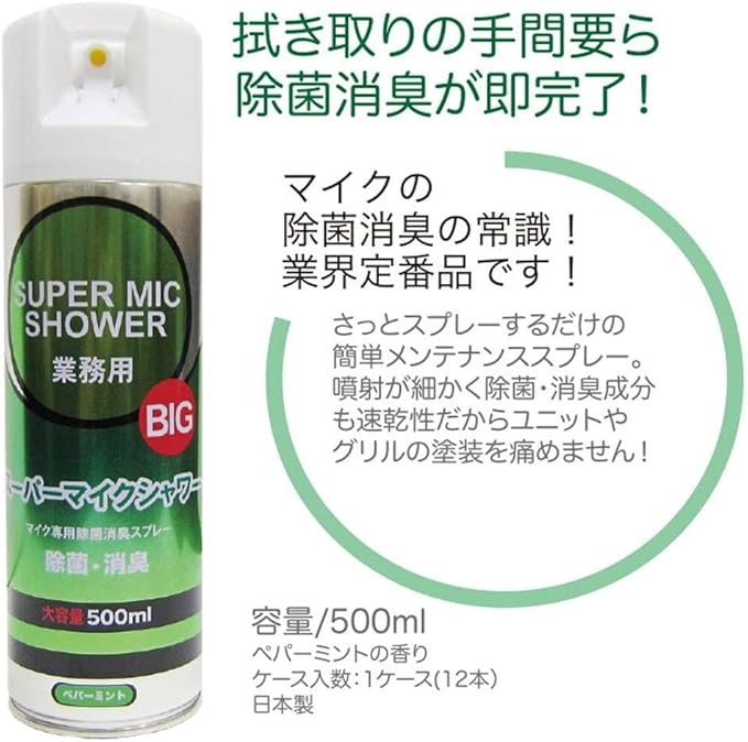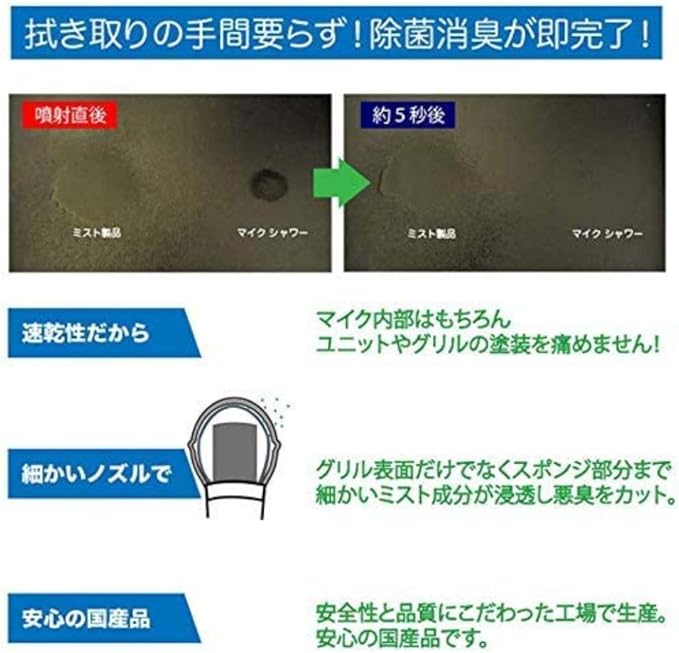 マイクから10cm離して約1〜2秒スプレーするだけで、除菌・消臭が即完了!度90%以上のため、速乾性が高く、マイク部分はもちろんユニットやグリルの塗装を痛めません。