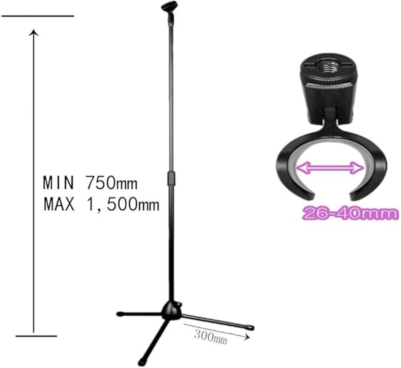 マイクホルダー1個付き。1:ワイヤレスマイク 等の太マイク対応クリップ型マイクホルダー 最大部分4cm。2:マイクホルダー内径 最大部分4.0cm 最小部分2.8cm。