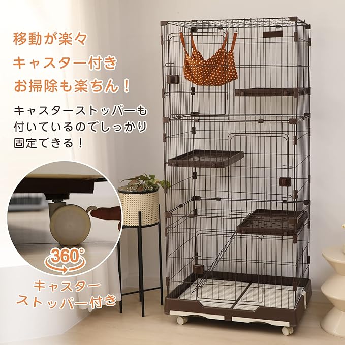 【移動に便利なキャスター付き】キャスターは全部で4個付きます。内2個はストッパー付きなので、使用時にはケージが動かないようにロックすることができます。キャスター付きなので、掃除の時は移動楽々!安定性にご心配なく!