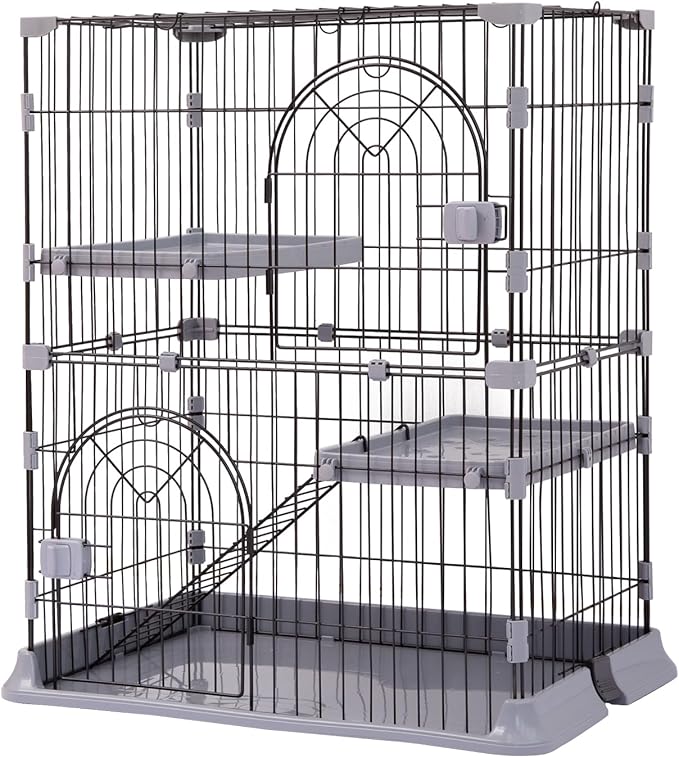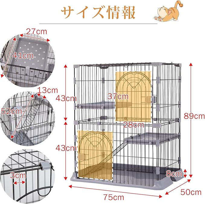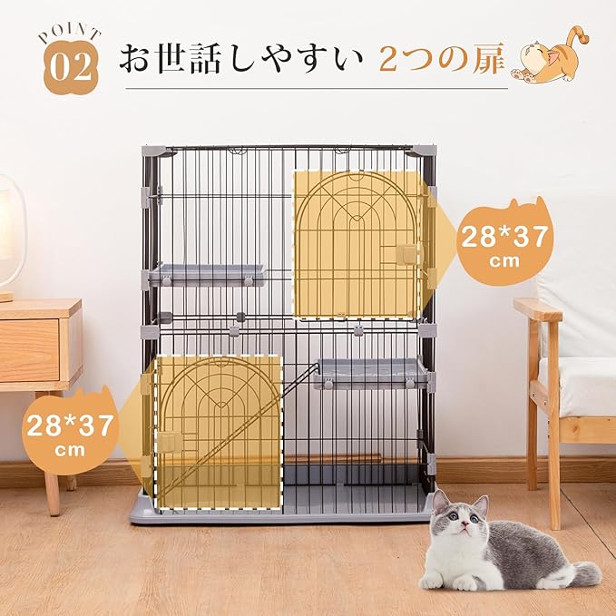 PETTOM 猫 ケージ キャットケージ 2/3段 猫ゲージ ワイド扉 多頭飼い 脱走防止 留守番 保護 脱走防止 多頭飼い 多頭 スチール ペットケージ (グレー色2段 74*50*89cm) | KAZESHOP