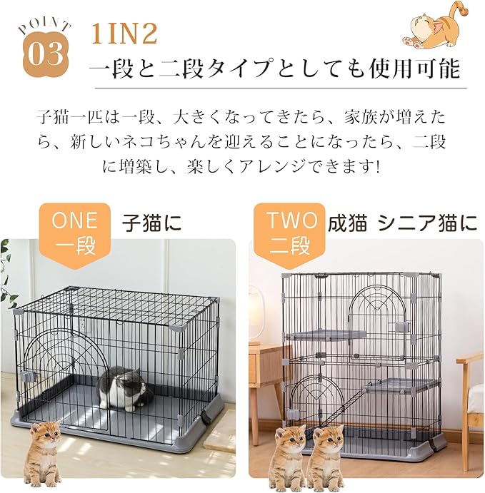 【1段、2段タイプとしても使用可能】子猫一匹は一段、大きくなってきたら、家族が増えたら、新しい猫ちゃんを迎えることになったら、二段または三段に増築し、楽しくアレンジできます。