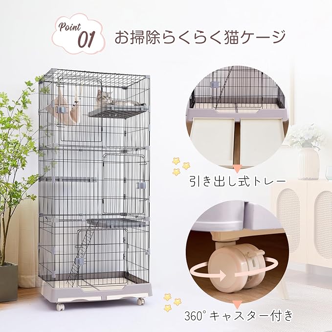 【 猫 ケージ 持ち運び・猫げーじ トイレ付き】猫 ケージ キャスター付き,お掃除らくらく猫ケージ,取り出し可能なトレー ,移動便利、お部屋の掃除も楽になります。