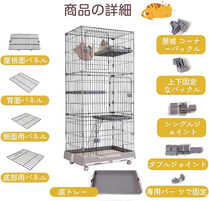 【広々としたスペース&猫 ケージ】猫ちゃんが利用してのんびりリラックスできます。上下運動もできる高さ。猫階段 付いているので、ケージの中でも楽しく遊べる。猫ケージ,留守中やワンちゃんから目を離す時、いたずらによる怪我や事故の防止にも役立ちますし、緊急時の避難用にも重宝します。ゆらゆら揺れるハンモックが付いて、猫ちゃんにのんびりと時間を過ごしています.らくらく猫 ケージ!