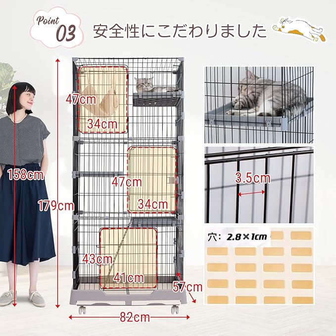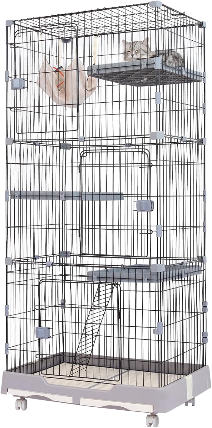 Shinyever 猫 ケージ キャットケージ 猫ゲージ 3段 大型 82*57*179CM キャスター ハンモック キャットケージ猫 梯子 ドア トレー ステップ 多頭飼い 脱走防止 留守番 1段 2段 組み替え自由 ペットケージ ねこ お掃除らくらく 日本語説明書 (グレー 3段) | KAZESHOP