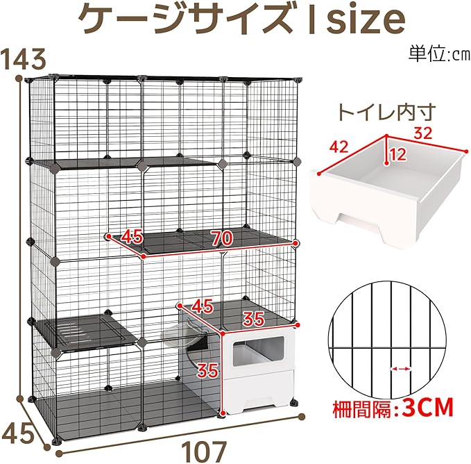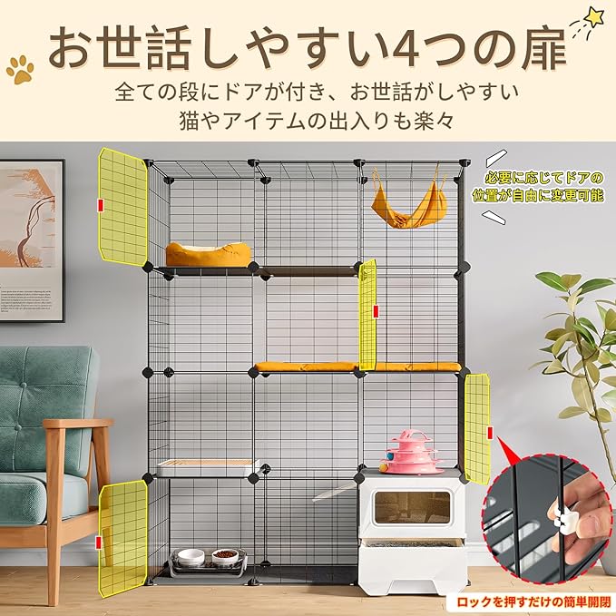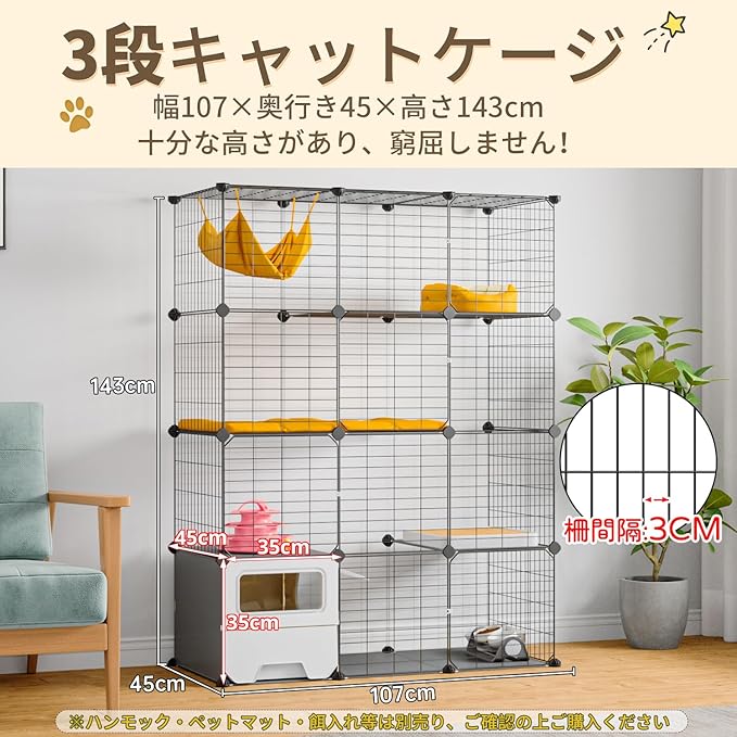 【3段猫用ケージ】サイズは高さ143 幅107 奥行き45cm、多頭飼いにも対応できる3段タイプ猫 ケージです。各段に棚板が付いており、自由に上り下りし、猫ちゃんの運動不足やストレスを解消してくれます。扉が4枚付いており、猫やおもちゃの出入りは簡単、ケージ内のお掃除も楽にできます。ドアロックが簡単に開閉できますが、ペットは中から開けられなく、脱走を効果的に防ぎます。