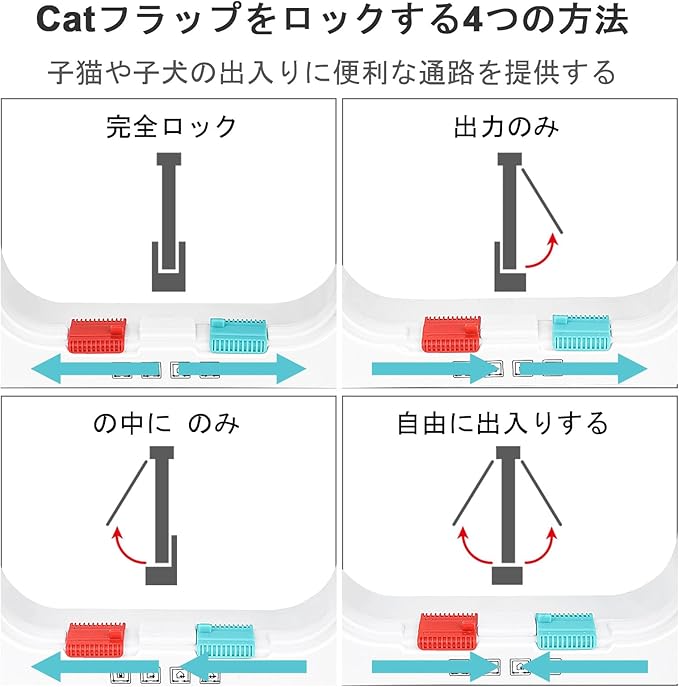 4つのロックモードをより安全に-スライドスイッチにより、アクセスモードを自由に出入り、完全にロック、出入りのみ、入場のみに調整し、ペットのアクセスを制御し、放浪動物から遠ざけることができます。