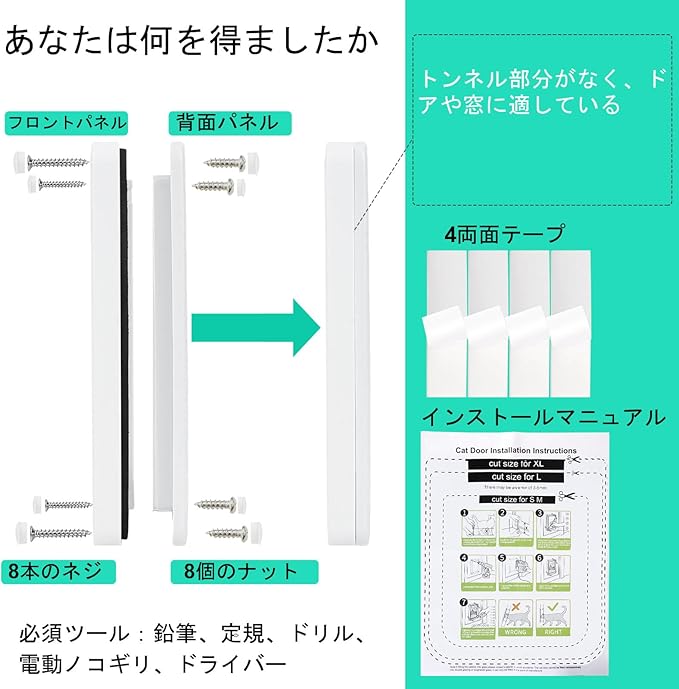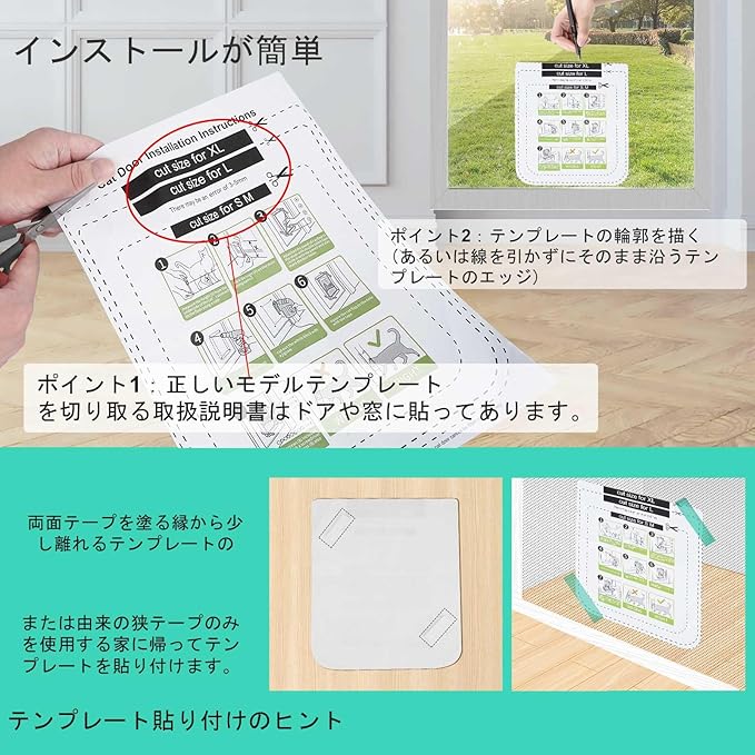 簡単な取り付け-パッケージには、詳細な説明(テンプレート付き)、8本のねじとそのナット、両面テープが含まれています。スライドガラスドアの猫ドアを簡単にカットして取り付けることができます。