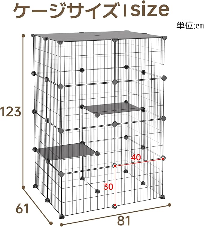 【広々としたスペース】サイズは高さ123 幅81 奥行き61cm、猫ちゃんがのんびりリラックスできます。高さがあり、棚板が2枚付き、ケージの中でいっぱい運動出来ます。トイレを置いても猫が歩けるくらいの広さがあり、快適で窮屈感ないです。