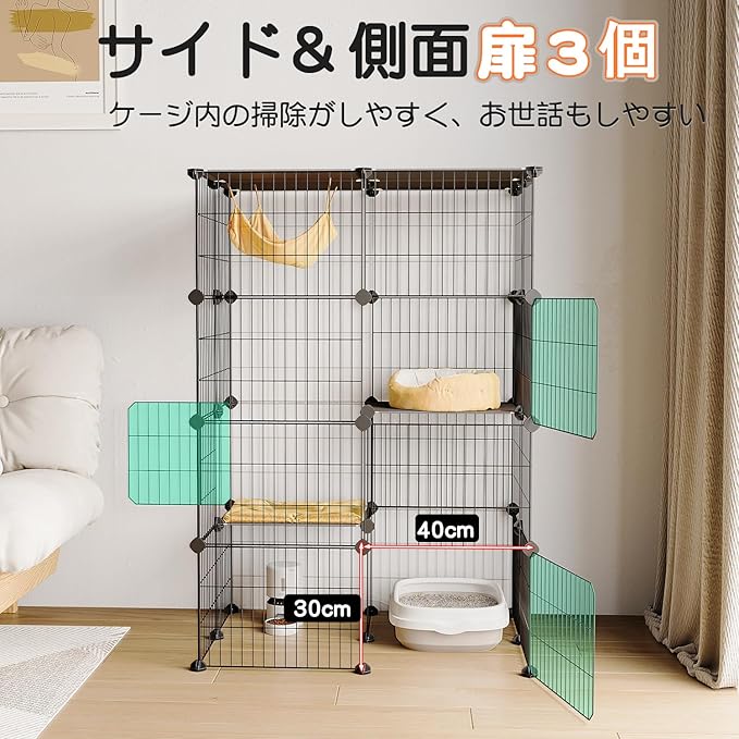 【出入れしやすい】幅広扉と側面扉が3枚付いており、猫や物の出し入れが簡単、お世話もしやすい。ドアロックが片手で簡単に開閉できますが、ペットは中から開けられませんので、脱走を効果的に防ぎ、お留守番も安心できます!