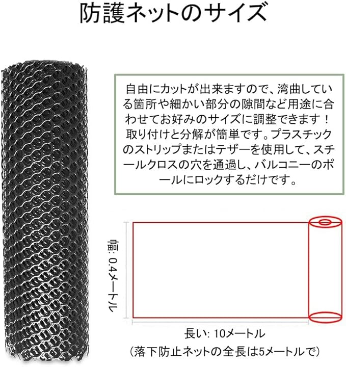 【適切なサイズ】穴0.8cm、 幅40cm 長さ10m。すべてのドア、窓、廊下、バルコニー、手すりに適しています。引っ張れば少し伸びる性質なので、ハサミでパチンと簡単に好みの形に変えられますし結束バンドの固定も凄く固いです。