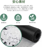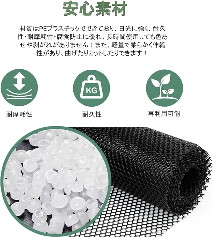 【耐久性の防護ネット】材質はPEプラスチックでできており、日光に強く、耐久性・耐摩耗性・腐食防止に優れ、長時間使用しても色あせや剥がれがありません!また、軽量で柔らかく伸縮性があり、曲げたりカットしたりできます!