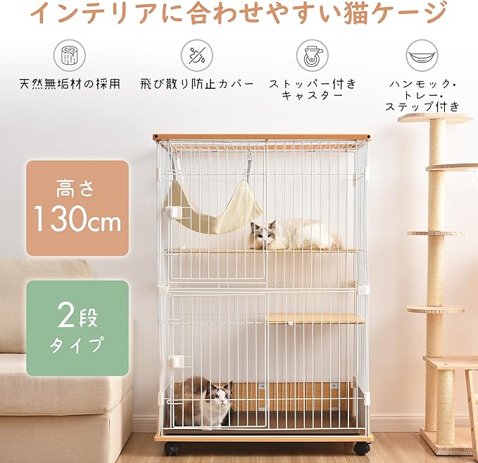 BTM 猫 ケージ キャットケージ 2段 幅広設計 自由組み合わせ 猫ドア付き ハンモック付き トレー付き 大型 猫ケージ キャットハウス ペットケージ 留守番 保護 脱走防止 多頭飼い おしゃれ | KAZESHOP