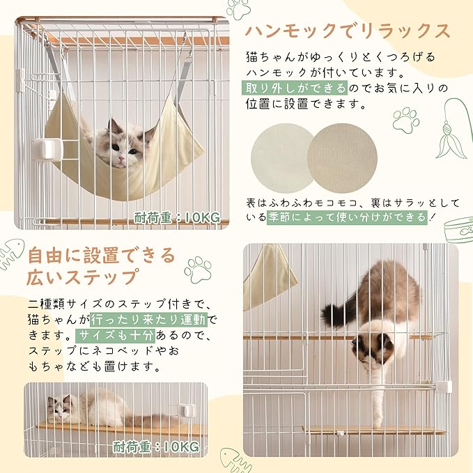 【広い棚板でのびのびリラックス】 二種類サイズの2つ棚板があり、猫ちゃんが上り下りしやすい。サイズも十分あるので、棚板に猫ベッドおもちゃなども置けます。ケージから棚板を出せるので、掃除に便利です。 ※棚板の耐荷重は10kgで、大型猫や多頭飼いでも安心!