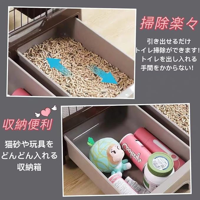 【ケージを開けずに掃除ができる】面倒だったトイレの掃除が、引き出しを開けるだけでとっても簡単になりました。 どんな猫砂でも使えます!