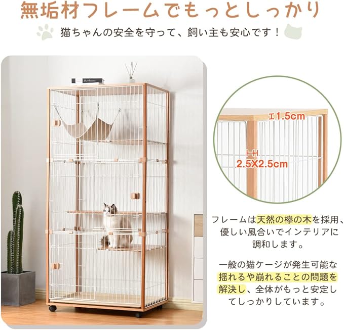【無垢材フレームでもっとしっかり】フレームは天然の欅の木を採用し、猫ちゃんには安心安全です。優しい木の風合いが、インテリアとしてもお部屋に馴染みます。揺れることや崩れることの問題を解決し、全体がもっと安定してしっかりしています。一般のキャットケージより耐久性が優れています。