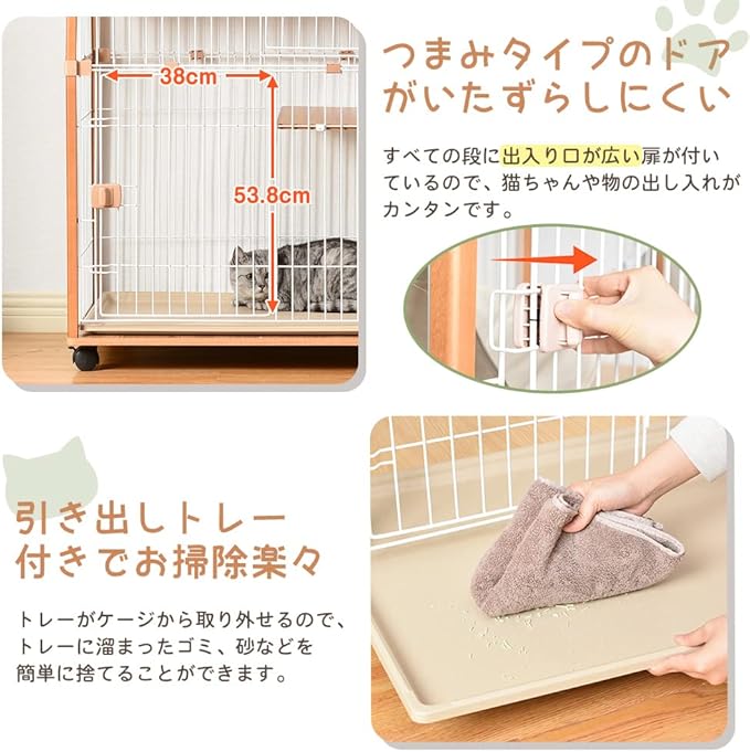 【開きやすいつまみタイプのドア】すべての段に出入り口が広い扉が付いているので、猫ちゃんや物の出し入れがカンタンです。ロックをつまむだけの簡単開閉、猫ちゃんがケージ中で開けることが無理なので、安心できます。