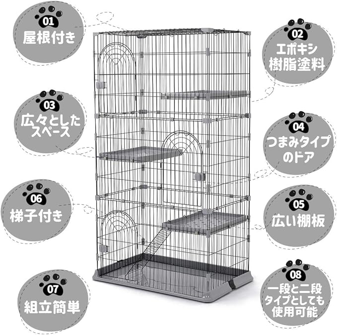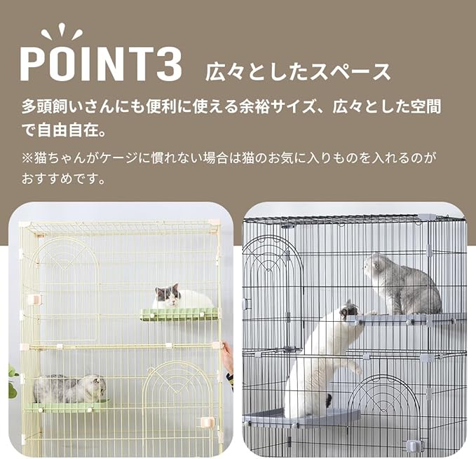 03広々としたスペースで窮屈しない 多頭飼いさんにも便利に使える余裕サイズ、広々とした空間で自由自在。 *猫ちゃんがケージに慣れない場合は猫のお気に入りものを入れるのがおすすめです。