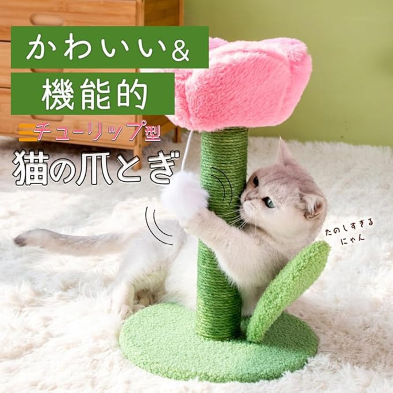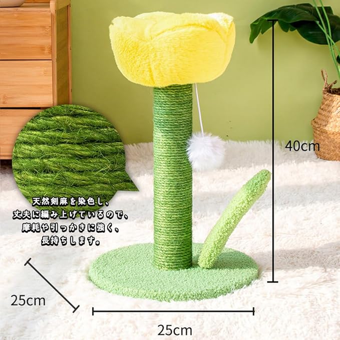 【 サイズ 】 高さ40cm、底面直径25cm【 素材 】 剣麻、綿 【 重量 】 0.8kg 【白いぽんぽんで遊べる】 白いぽんぽんが付いており、猫ちゃんが爪とぎだけでなく、オモチャとしても楽しめます。お花のそばで遊ぶ姿がとても愛らしいです。