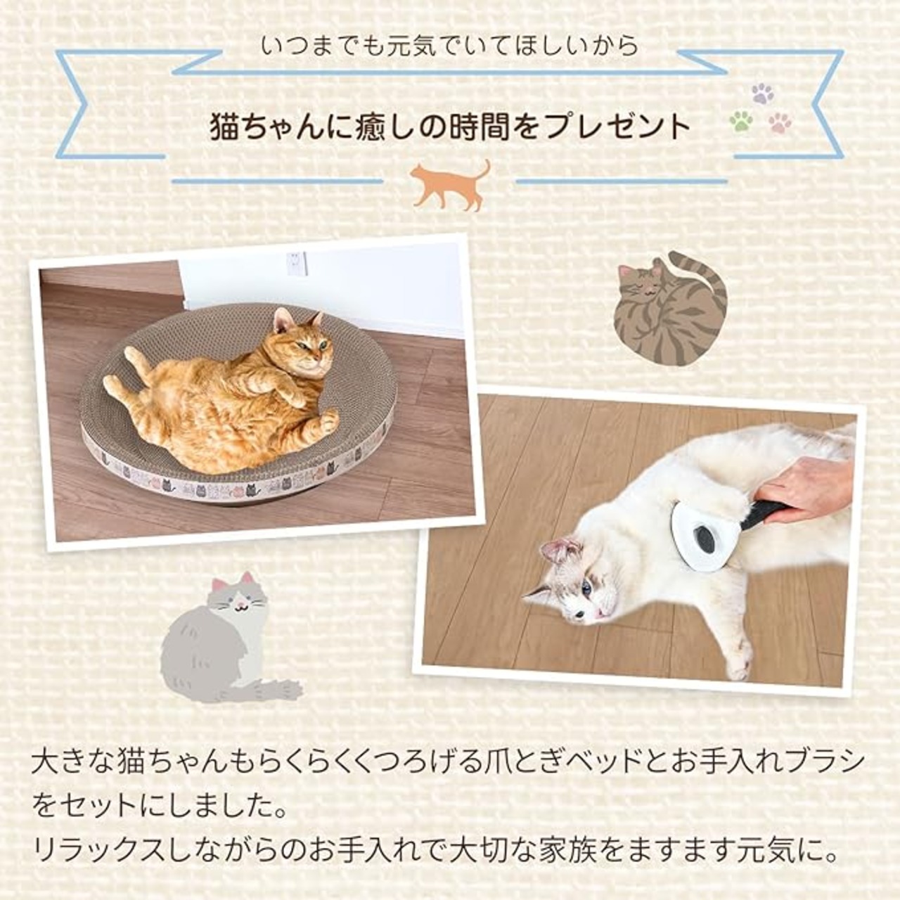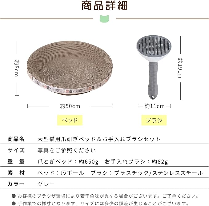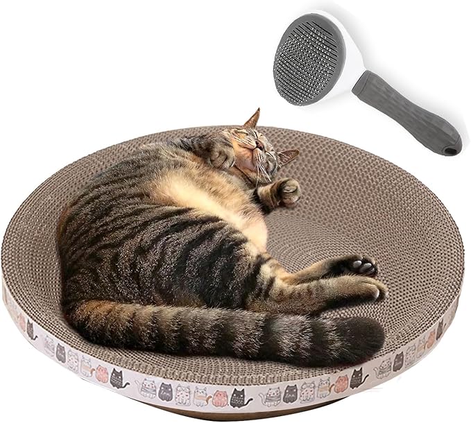 猫ちゃんが快適に使える大型の丸型爪研ぎ。大きいサイズで広々寝そべり、ダンボール素材でしっかり研いでもらえます。さらに付属のブラシでブラッシングもできます。