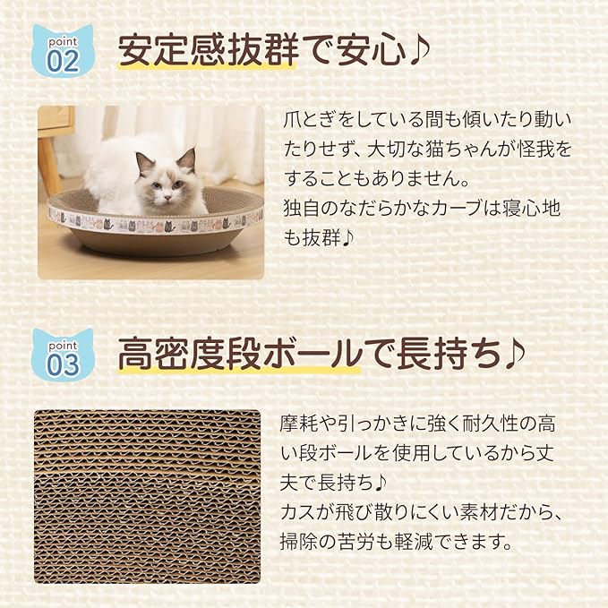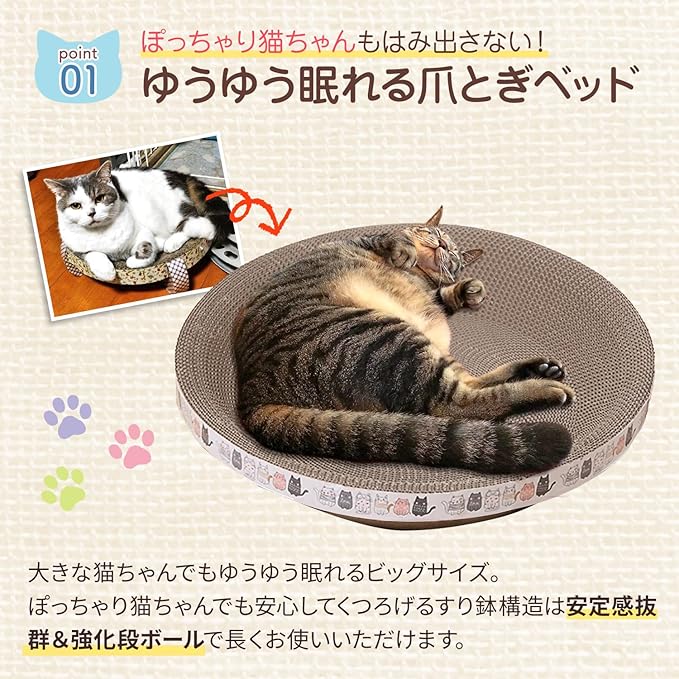 猫の習性に合わせた丸型爪研ぎ。広めの大きいサイズと丈夫なダンボール素材で、大型の猫でも快適に使えます。