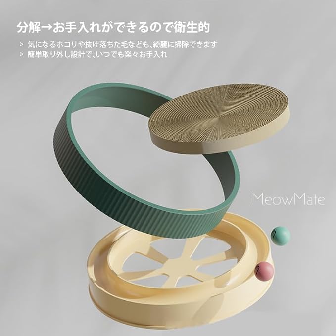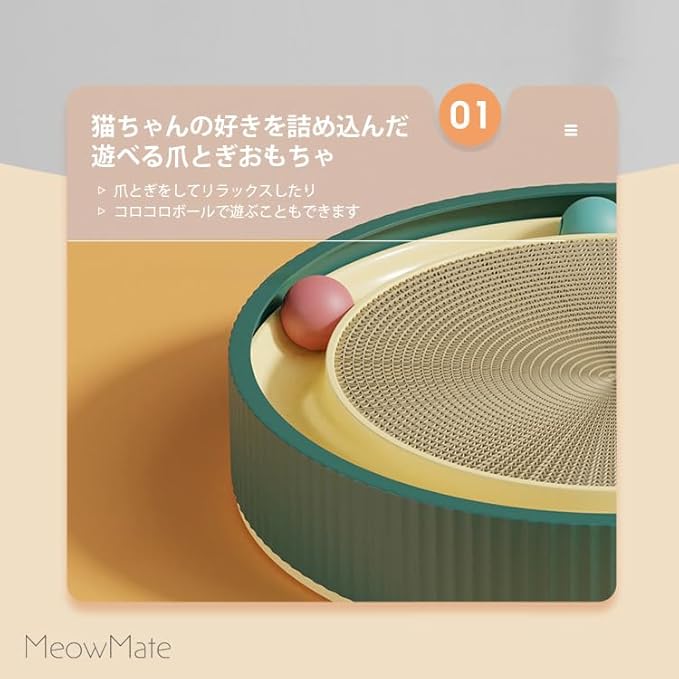 【遊べる爪とぎ】爪を研いだり、遊んだり、お気に入りのスペースとしてくつろいだり。中央には段ボール製の爪とぎを備え、思う存分にカリカリできます。爪とぎの外側にはコロコロと転がる2つのボールがあり、猫ちゃんの狩猟本能を掻き立てます。ボールは取り外しも可能なので、夜の気になる時間帯も安心です。