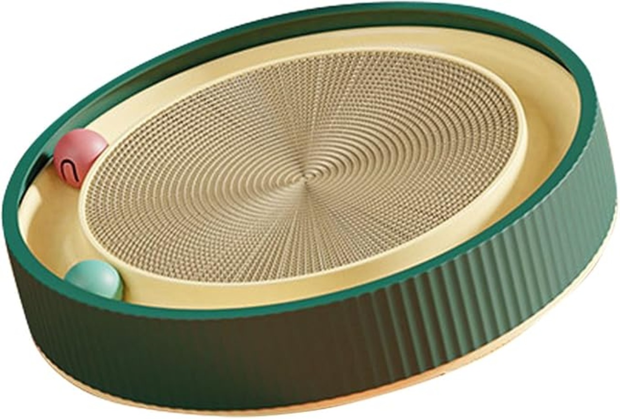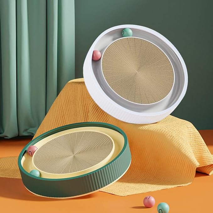 【仕様】サイズ:直径40cm 高さ7cm、爪とぎ部分:直径34cm、材質:プラスチック(本体、ボール)/段ボール(爪とぎ)、またたび粉付き(別袋)